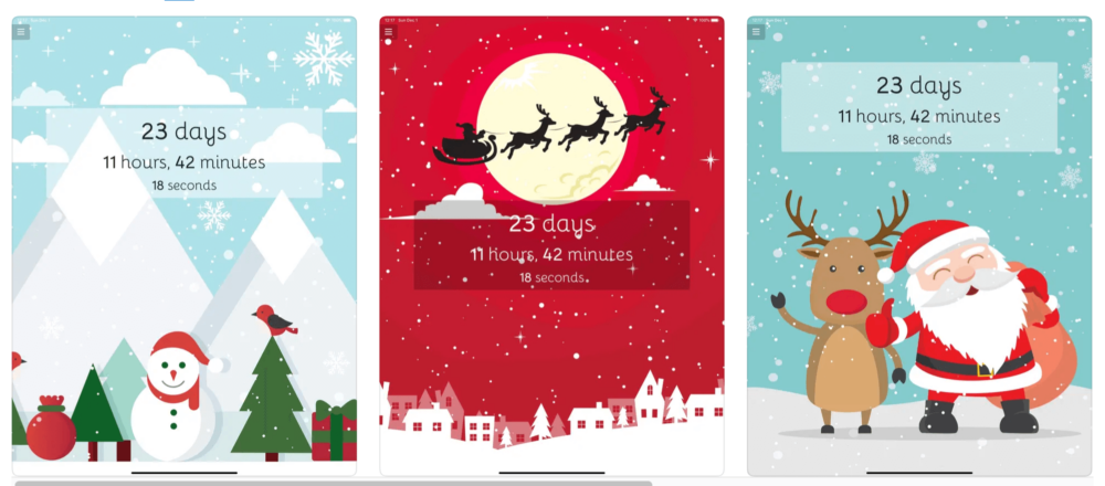 A peaceful, ad-free countdown app with music, snowfall, daily advent photos, and premium extras like widgets and more backgrounds. Count down the days until Christmas with a fun snowy countdown. Choose from a selection of beautiful backgrounds, featuring Santa and his reindeer, many Christmas trees, and even a snowman! Enjoy classic Christmas music including Deck the Halls and We Wish You a Merry Christmas