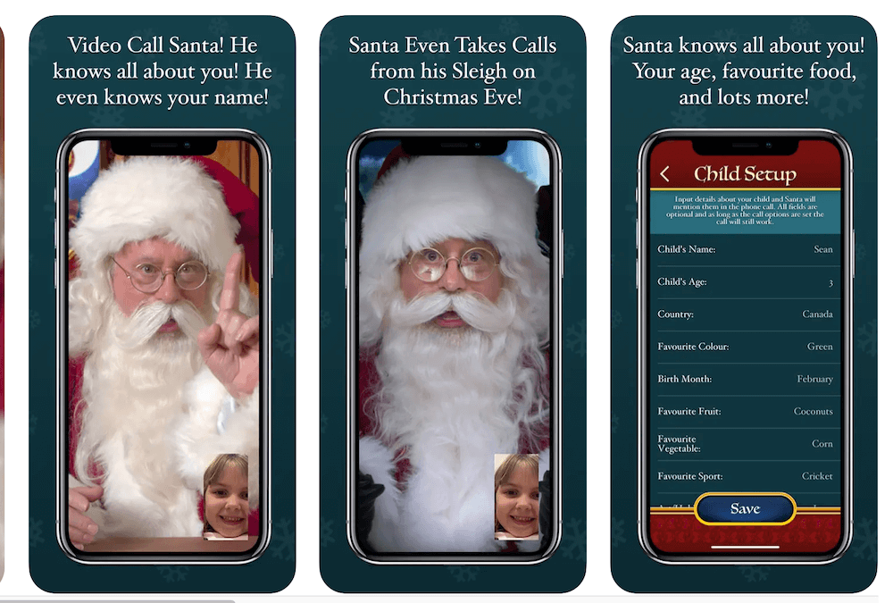Video Call Santa! Voice Call Santa! Message Santa! Track Santa! The only Santa Video Call app with varied and customizable conversation options! Santa actually knows all about you (12 facts including your name)! On Christmas Eve you can even talk to Santa while he’s on his sleigh!