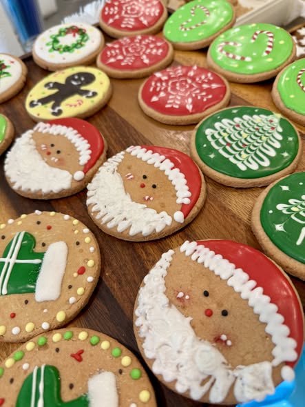 We have a variety of new items—bright and colorful Christmas cakes topped with Santa, Christmas-tree croissants, bow-shaped pastries, and our crispy-layered Napoleon cake.